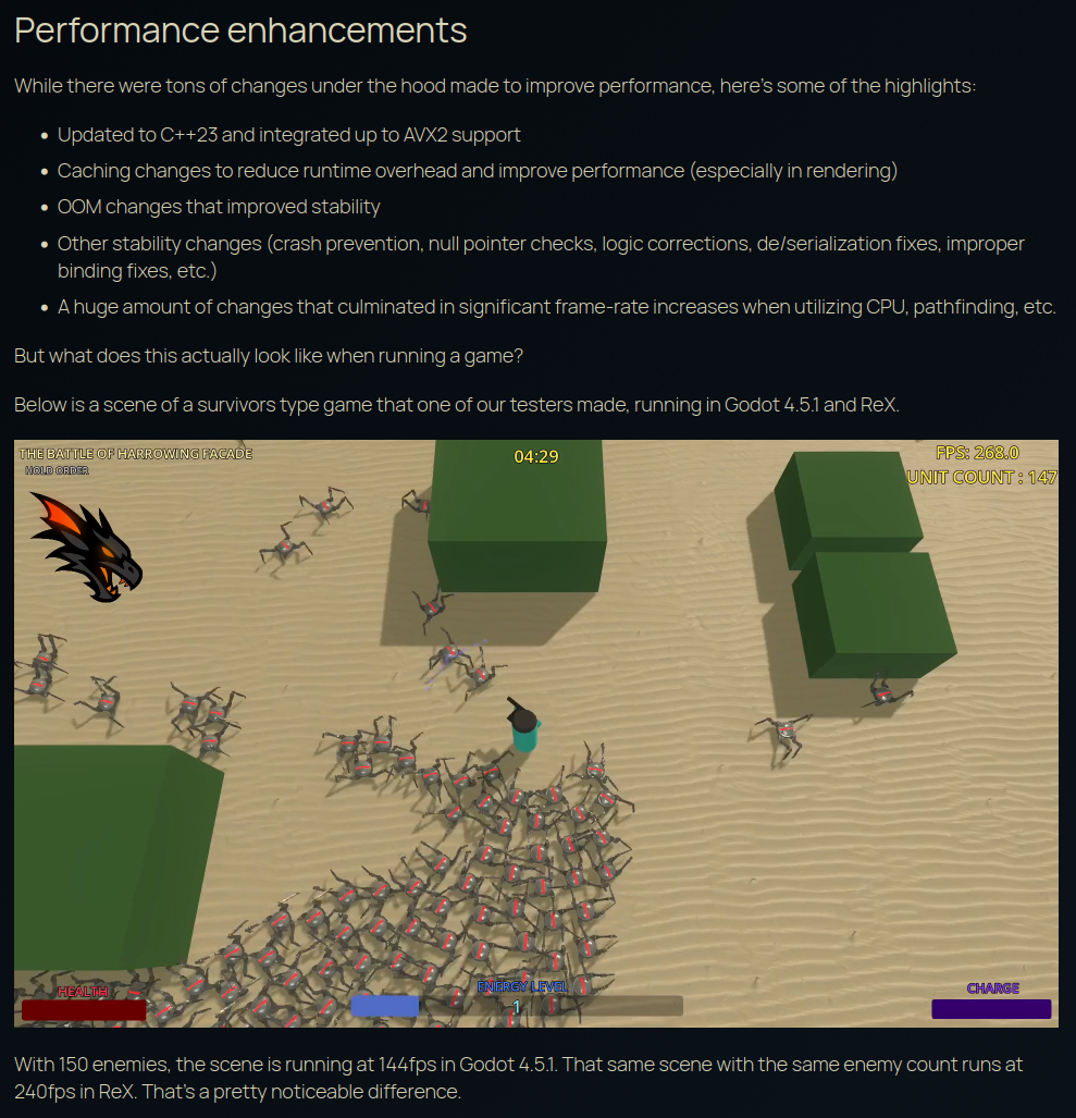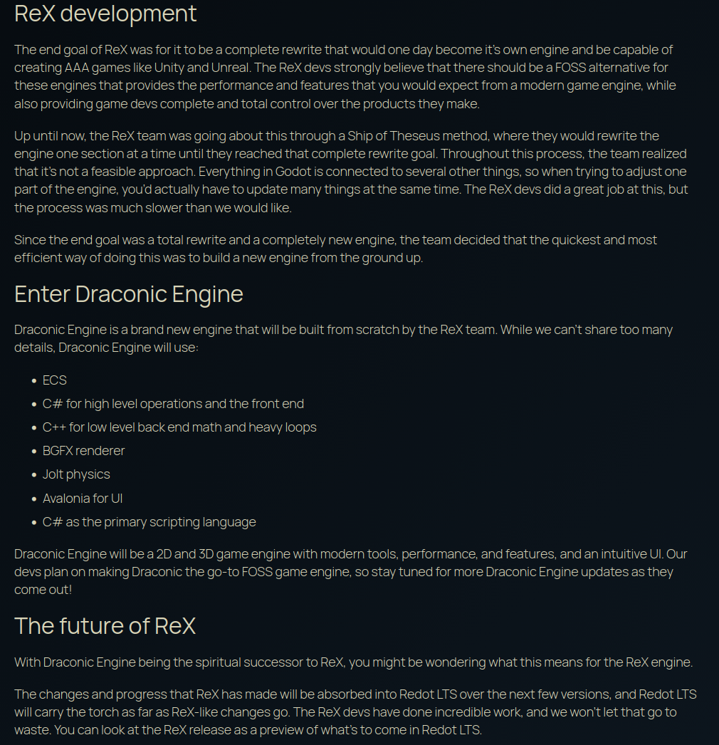 The Redot autists just released 0.0.1 of their ReX fork. By the sounds of it, they'll gradually be moving ReX's improvements back into regular Redot and putting more focus on a new engine that's more in line with what they're aiming for instead of slowly rewriting Godot and fighting Juan's crappy architectural choices all the way.