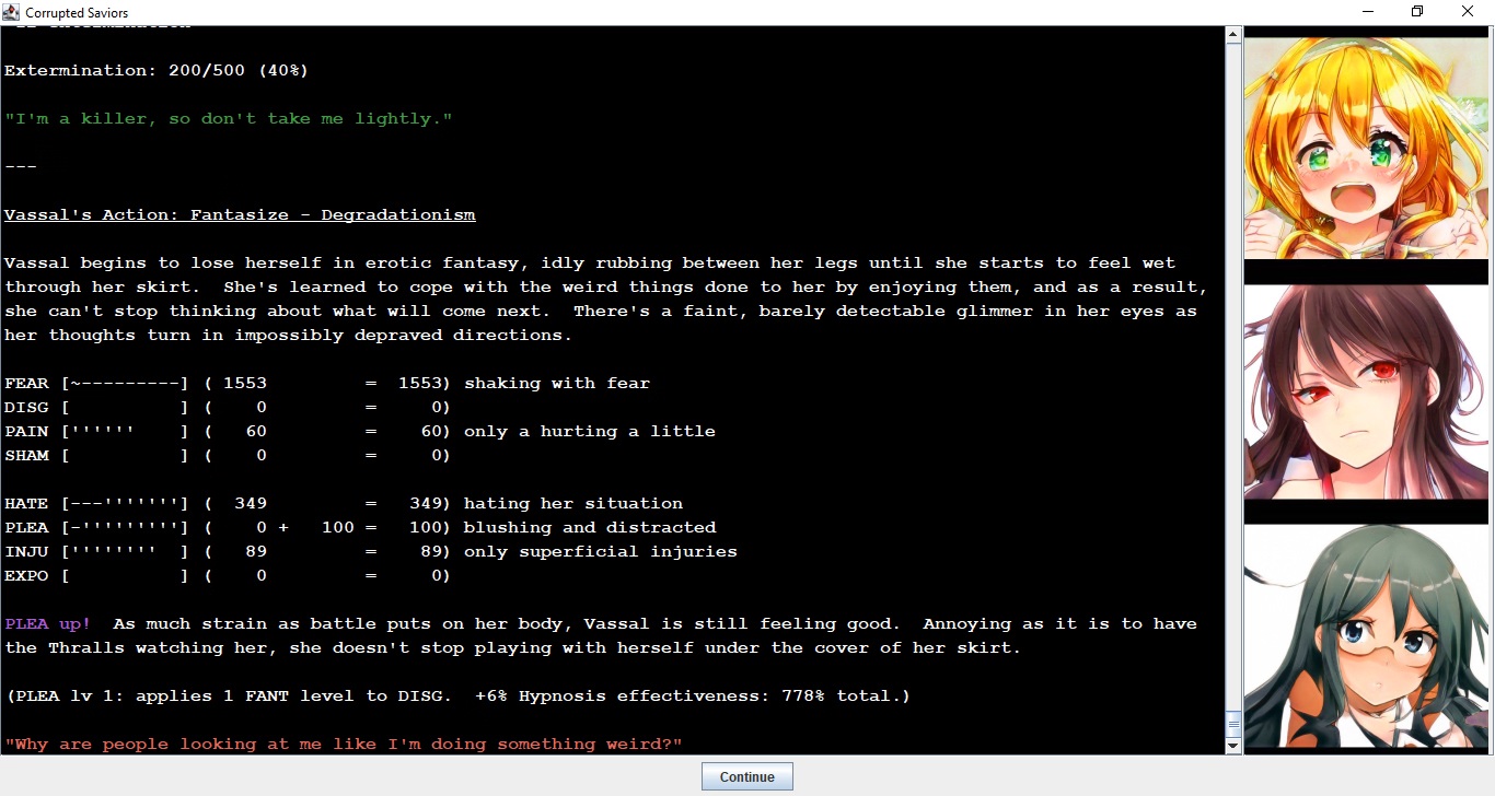 If you're still here, you'll probably like the game! It is a very well-realized design, with a tight tactical, thinky gameplay loop. You have to carefully consider the (mental) weaknesses of the girls when deciding how to break them: you can get lots of Evil Energy (upgrade currency) from raping an innocent virgin, but a jaded, hardened warrior might be more traumatized by being humiliated in battle and made to feel powerless instead. If you play your cards right, you can make the girls hate each other, or bond more closely over their shared traumas; both options have advantages and disadvantages.