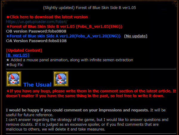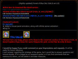 FOBS, or Forest of Blue Skin, is an HGame made by Zell999 where you control a shota in a world where you can beat and capture or get raped by monster girls. You can capture these monster girls by performing certain actions and attaining skills, and using them in interesting ways. Updates usually every couple of months, the builds of the game right now are free as it is still in development. The dev intends to sell the game once development on it reaches a certain point.