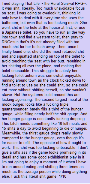 I agree with you both, which is exactly why I want to make that kind of board, so shit like this can be discussed, what's good about games, what's wrong about them, how they could improve, etc. The only way to improve, in my opinion, even in a small niche circle, without relying on cesspools like fag95zone. Especially because I'm a dev myself, and I'm really tired of brain damaged retards.