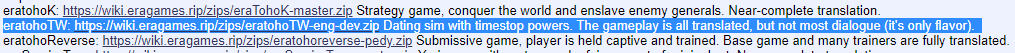 eratohoTW: https://wiki.eragames.rip/zips/eratohoTW-eng-dev.zip Dating sim with timestop powers. The gameplay is all translated, but not most dialogue (it's only flavor).