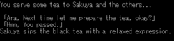 I'm not generally a fan of that particular type of laugh, either, especially when it's overused, but it's been growing on me in the last few years. Too, the reason for leaving it in (that's what's actually written and it's reasonably understandable without being changed to an English equivalent) feels more rigorous than the one for leaving it out (it sounds kind of dumb). Really, you can't blame the Japanese for using a phonomime for laughter there, considering that English writers would do the exact same thing in that context. The Japanese tendency for girl dialog files seems to be to not put descriptive nondialog on the same line as actual dialog, so it'd be a little jarring if something else was done such as moving the laughter out of the quotes and narratively describing it. That also seems to be why throwing hearts in the dialog is popular.