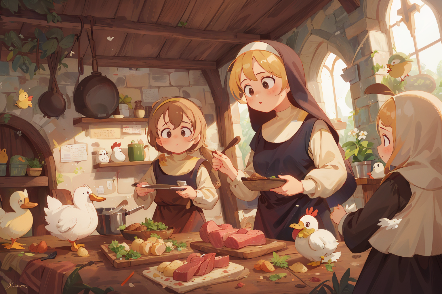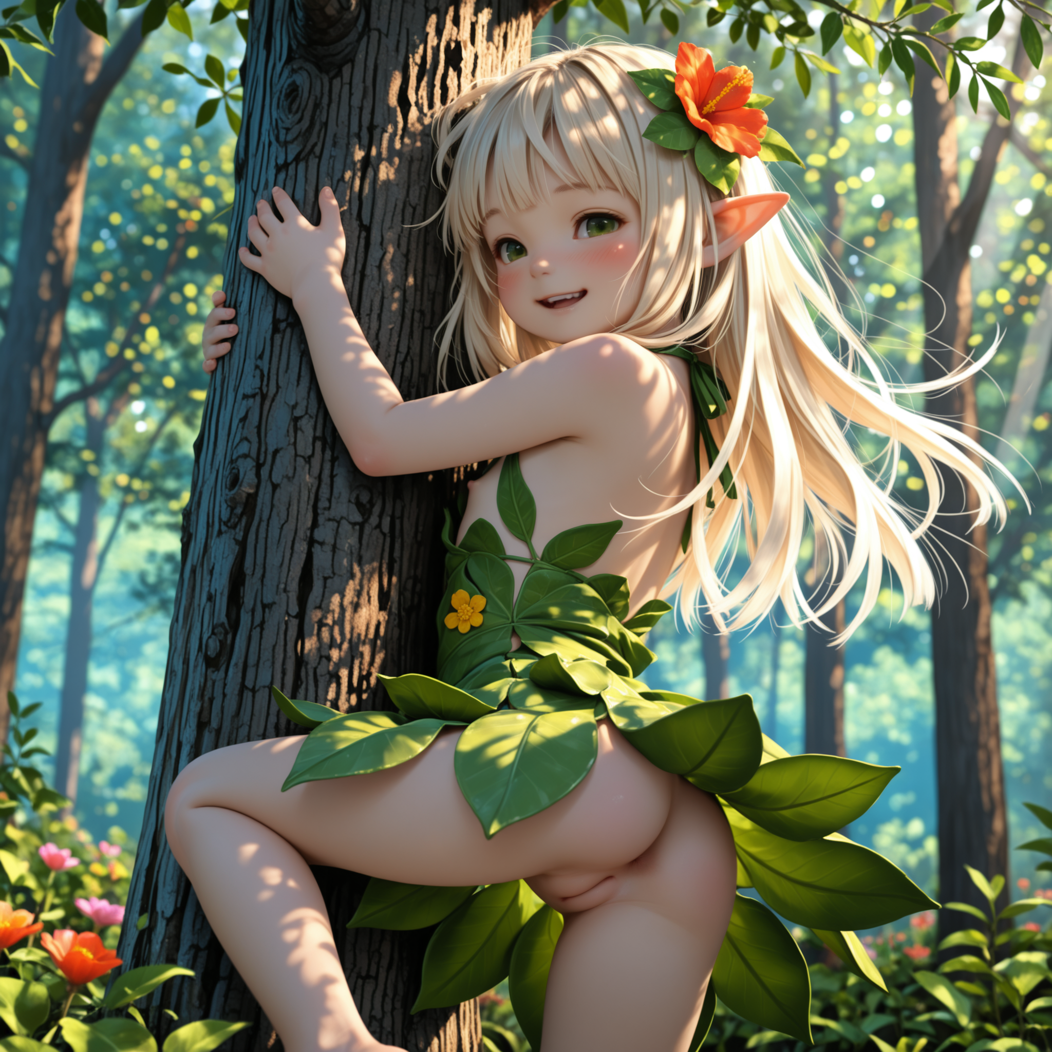 I like her blush, but I want to see her from behind now, let's get some butts up in here. Adding prompts "rear view", "looking back at viewer", "bent over", and "cute butt" to the prompt, we get Image 4.