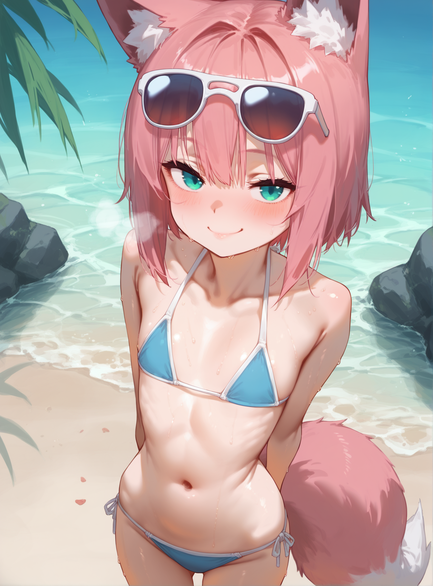 Why isn't she wet? She's been bathing, she really should be wet, right? Adding (wet:1.2) and (wet hair:1.2) should do it. Let's also make her a foxgirl instead (also switching out "cat tail" to "fox tail", of course). Image 5 is the result.