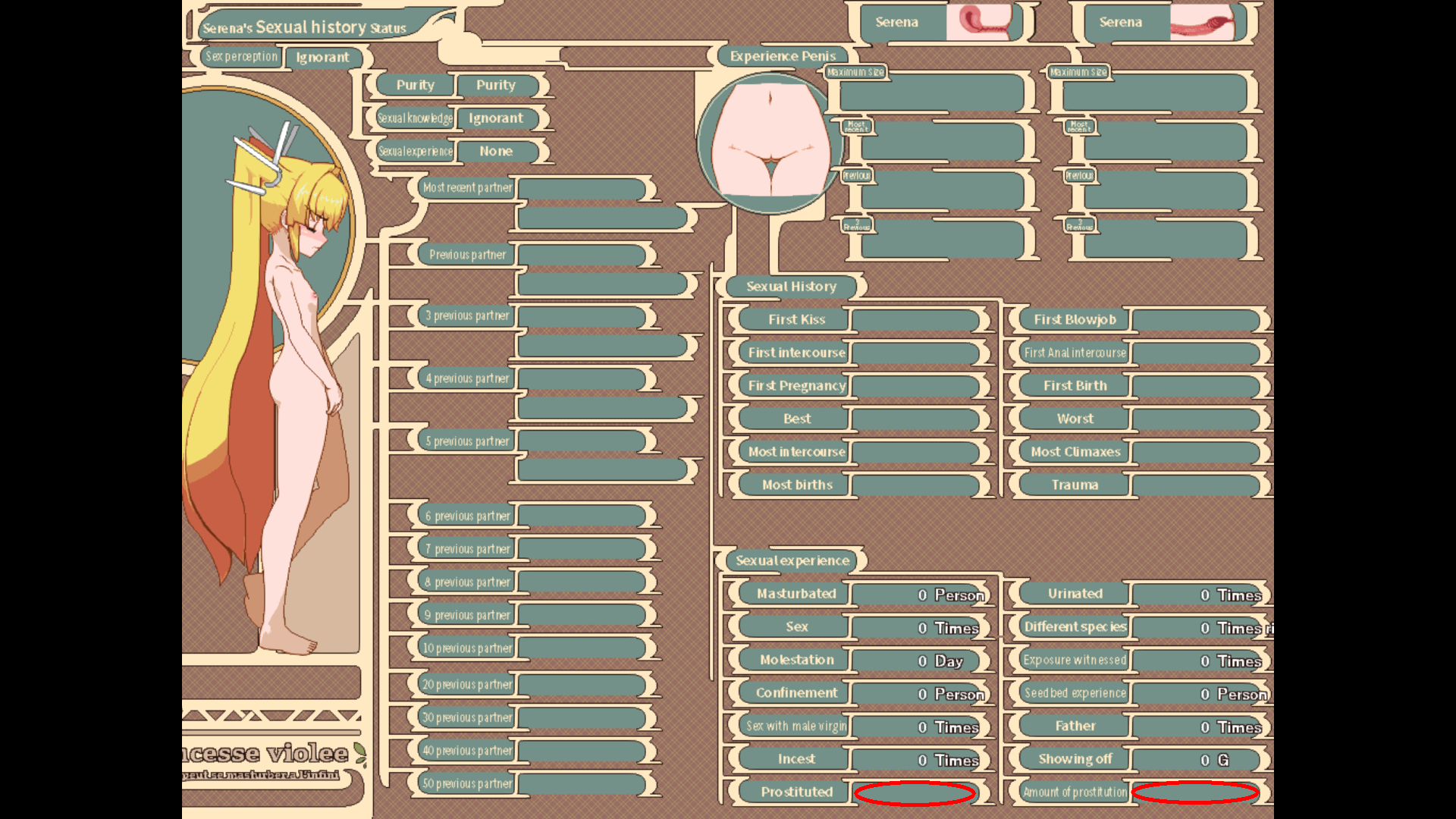 The same screen in the Japanese version has those two columns with 6 lines each, not 7. So some statistics were abandoned. Were there even any scenes of her masturbating in the first place?