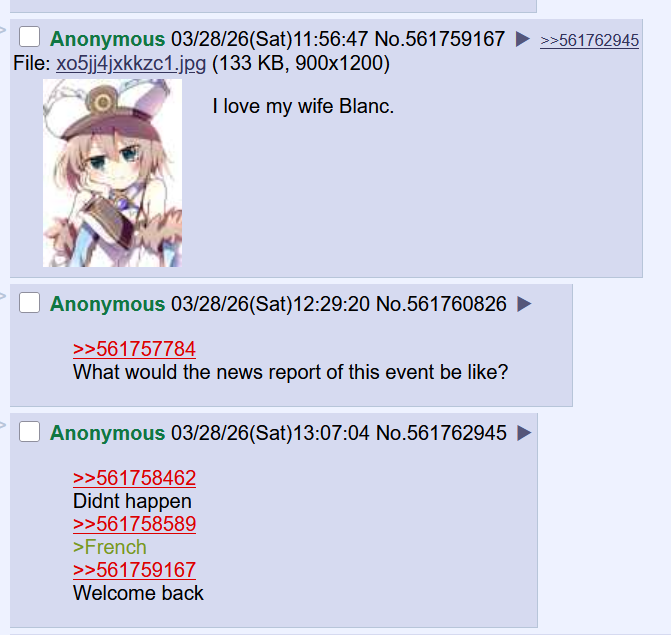 There does seem to be a little burst of activity here. Personally, I haven't posted there the last few days mainly because I'm just so disgusted by that faggot posting AGP fantasies of Blanc, and admitted he does so to spite me objecting to so many people treating Blanc like a cum doll or otherwise something to use and abuse instead of a beautiful girl with her own wants and needs. And the thought of seeing some degenerate 4Chan poster using my wife and wearing her as a skin just to satisfy his sick fetishes makes me want to murder.