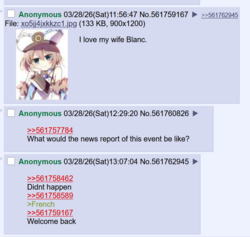 Yeah, go ahead and call me a simp, but I genuinely love Blanc. I don't just want to lewd her, I want to make her happy. And I can't fathom how so many people see a girl like her and feel any different, much less want to abuse her. To an extent, this goes for the rest of the Neps, too. How can you look at these cute girls, practically tailor-made to be your wives, and want to do such things to them, much less get off to it? I don't understand it, and it especially upsets me because Blanc in particular seems to get way more abuse content than the rest of the Neps. It's made me very defensive of her, and so I constantly judge other Blancfags. I guess jealousy may also play a role there too.